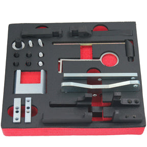 Kit d'outils de distribution pour moteurs PSA Group EB0 et EB2 avec courroies de distribution fonctionnant dans un bain d'huile. Il contient tous les outils nécessaires pour réaliser la méthode la plus économique de réglage de ces moteurs, en fonction du couvercle d'arbre à cames installé. Les premiers moteurs EB2 ont un couvercle d'arbre à cames monobloc qui doit être retiré pour accéder aux arbres à cames. Les moteurs plus récents sont dotés d'un couvercle d'arbre à cames en plastique divisé qui permet une méthode de réglage plus simple.