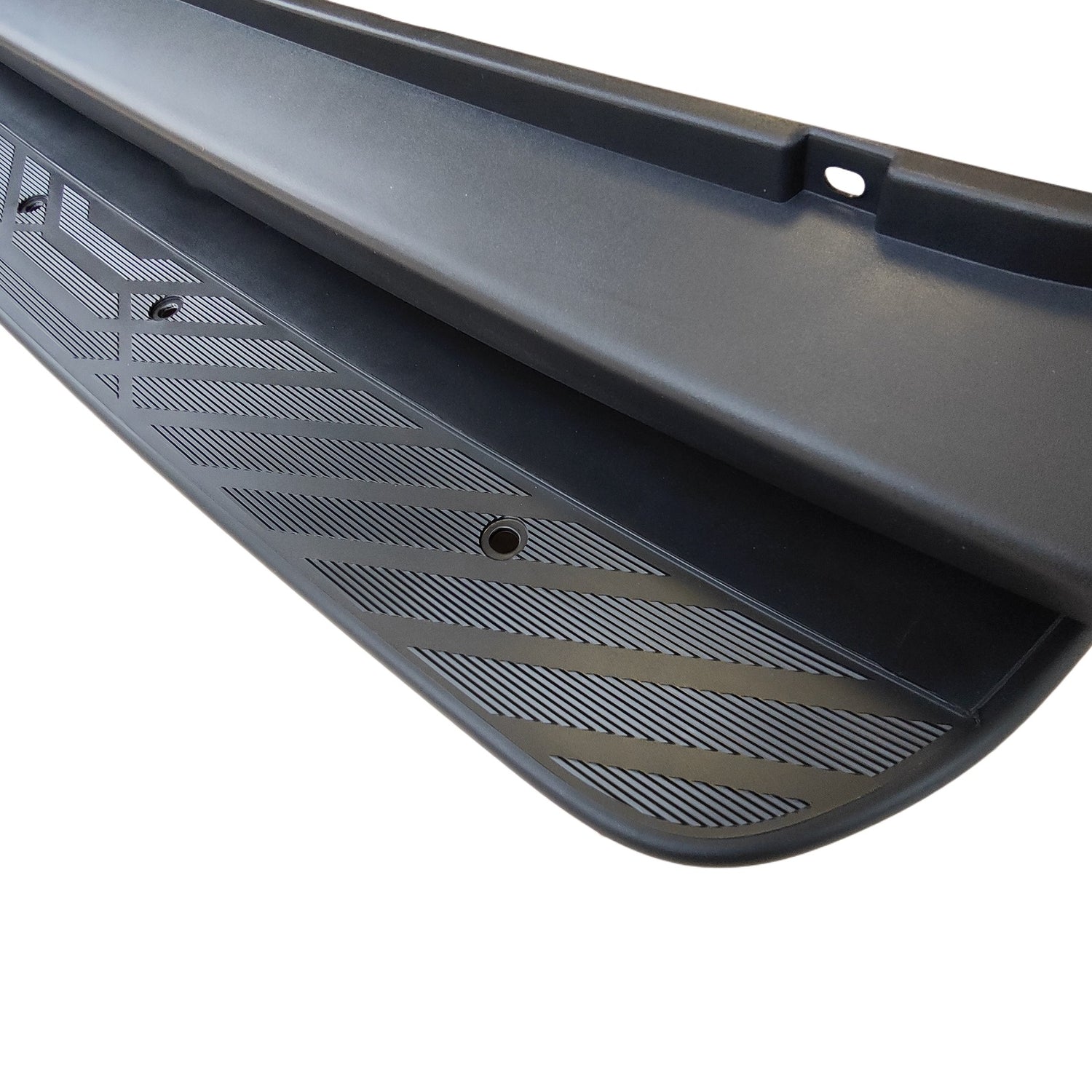 Hochwertiges hinteres Trittbrett aus robustem Kunststoff, kompatibel mit Mercedes-Benz Sprinter 906 und Volkswagen Crafter ab Baujahr 2006 bis 2018. Die stabile Einstiegleiste erleichtert den sicheren Zugang zum Laderaum und erhöht die Funktionalität des Fahrzeugs im täglichen Einsatz. Das langlebige, schwarze Design ohne PDC-Löcher (ohne Parksensor-Aussparungen) gewährleistet eine saubere Optik sowie maximale Widerstandsfähigkeit gegen Abnutzung, Schmutz und Witterungseinflüsse. Ideal als Ersatzteil in OEM-naher Qualität.